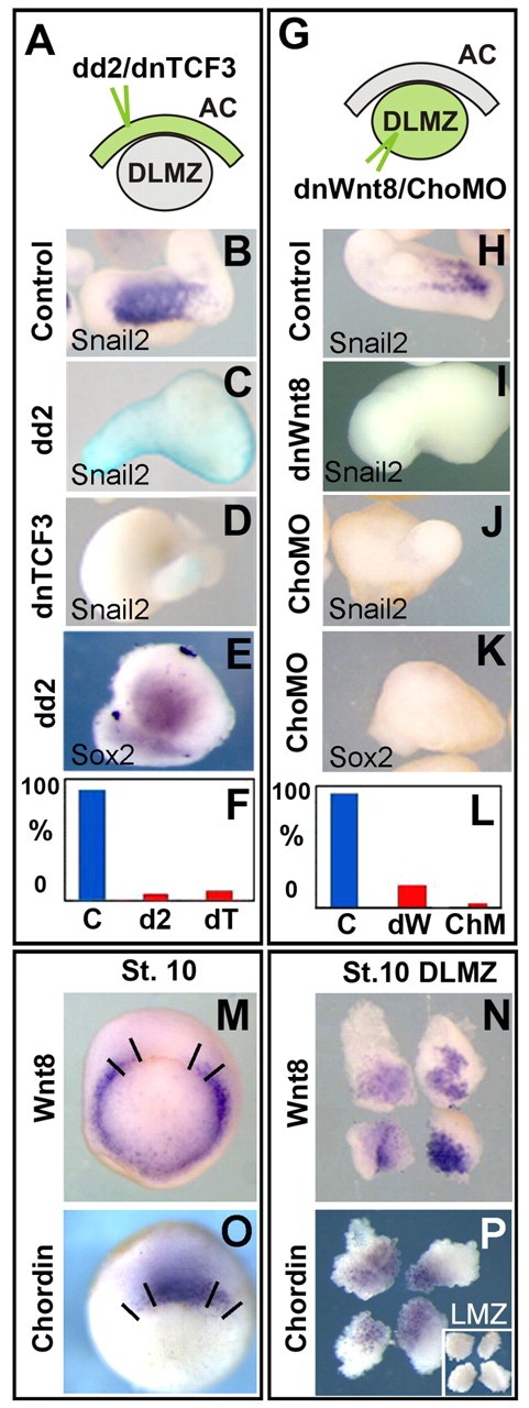 Fig. 3. Early Induction of the NC by DLMZ requires Wnt activation and BMP inhibition. (A-F) The DLMZ was dissected from stage 10.5 embryos and conjugated with animal caps taken from embryos injected at the eight-cell stage with 1 ng of dd2 or 0.6 ng of dnTCF3 mRNA together with FLDx. The conjugates were cultured until the equivalent of stage 15 and the expression of Snail2 (B-D) or Sox2 (E) was analysed. (B) Control conjugate of DLMZ with uninjected animal cap. (C) Conjugate of DLMZ with an animal cap injected with dd2 mRNA. (D) Conjugate of DLMZ with animal cap injected with dnTCF3 mRNA. (E) Sox2 expression showing continued presence of neural plate (68%, n=19). FDX injected animal caps also express Sox2 (data not shown, 63%, n=11). (F) Summary of the expression of Snail2 in conjugates. Each experiment was repeated three times with at least 26 explants each. (G-L) The DLMZ was dissected from stage 10.5 embryos injected at the eight-cell stage in the equatorial region with 1 ng of dnWNT8 mRNA or 2 ng of morpholinos against chordin (cho MO), and conjugated with animal caps taken from uninjected embryos. The conjugates were cultured until the equivalent of stage 15 and the expression of Snail2 (H-J) or Sox2 (K) was analysed. (H) Control conjugate. (I) Conjugate containing DLMZ injected with dnWnt8 mRNA. (J) Conjugate containing DLMZ injected with cho MO. (K) Sox2 expression showing inhibition of neural plate by cho MO (0% of expression, n=30), when compared with controls (75% of expression, n=20; not shown). (L) Summary of the expression of Snail2 in conjugates. Each experiment was repeated three times with at least 30 explants each. (M,N) In situ hybridisation of Wnt8 in a stage 10.25 gastrula (M) or in DLMZ (N). (O,P) In situ hybridisation of chordin in a stage 10.25 gastrula (O) or in DLMZ (P); inset in N shows LMZ. Lines in M and O indicate how the DLMZ was dissected.