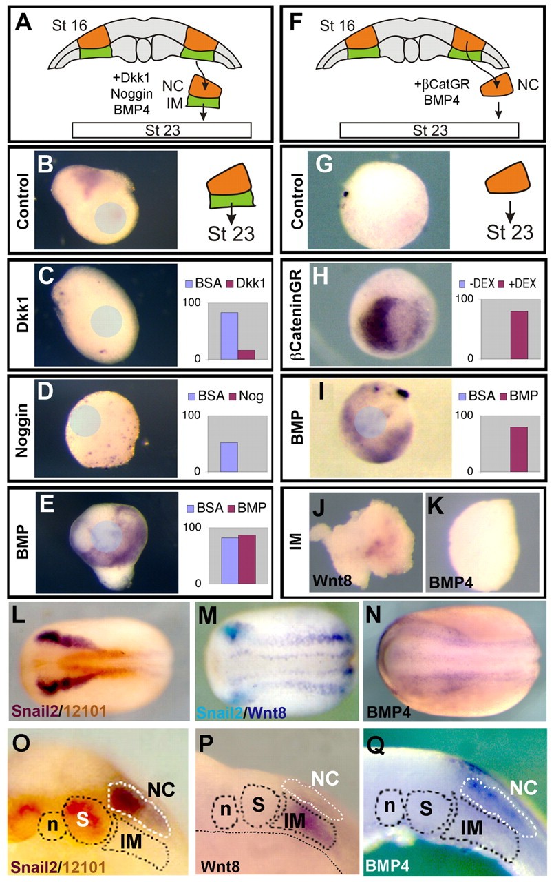 Fig. 5. NC maintenance requires activation of Wnt and BMP. (A-E) Explants of the NC and underlying intermediate mesoderm were taken at stage 16, cultured until sibling embryos were at stage 23 and analysed for the expression of the NC marker Snail2. Position of beads is indicated by the blue circle. (A) Diagram of experiments shown in B-E. (B) Control explant cultured in the presence of BSA-soaked bead. (C-E) Explant cultured in the presence of beads soaked with Dkk1 (C), Noggin (D), BMP4 (E). (F-I) Explant of the NC alone were taken at stage 16 and cultured until sibling embryos were at stage 23, then analysed for expression of Snail2. (F) Diagram of experiments shown in G-I. (G) Control explant. (H) Explant from embryos previously injected with β-cateninGR were cultured with or without dexamethasone. (I) Explant cultured in the presence of BMP. For each condition, the percentage of conjugates expressing Snail2 is summarised in the graphs. Each experiment was repeated at least three times. (J,K) IM was dissected from stage 16 embryos and the expression of Wnt8 (J) and BMP4 (K) was analysed. (L-Q) Analysis of NC markers and inducers in stage 16-18 neurula embryos as indicated. (L) Double stating against Snail2 and 12-101 antigen (a muscle specific monoclonal antibody) (Kintner and Brockes, 1984). (M) Double in situ hybridisation against Snail2 and Wnt8. (N) BMP4 expression. (O-Q) Sections of equivalent embryos to those shown in L-N. n, notochord; S, somites; IM, intermediate mesoderm; NC, neural crest. (O) Snail2/12-101 staining showing that it is the IM and not the somite the tissue that underlay the NC. (P) Wnt8 is expressed in the IM. (Q) BMP4 is expressed in the ectoderm next to or within the NC.