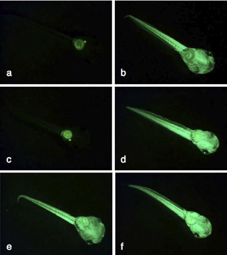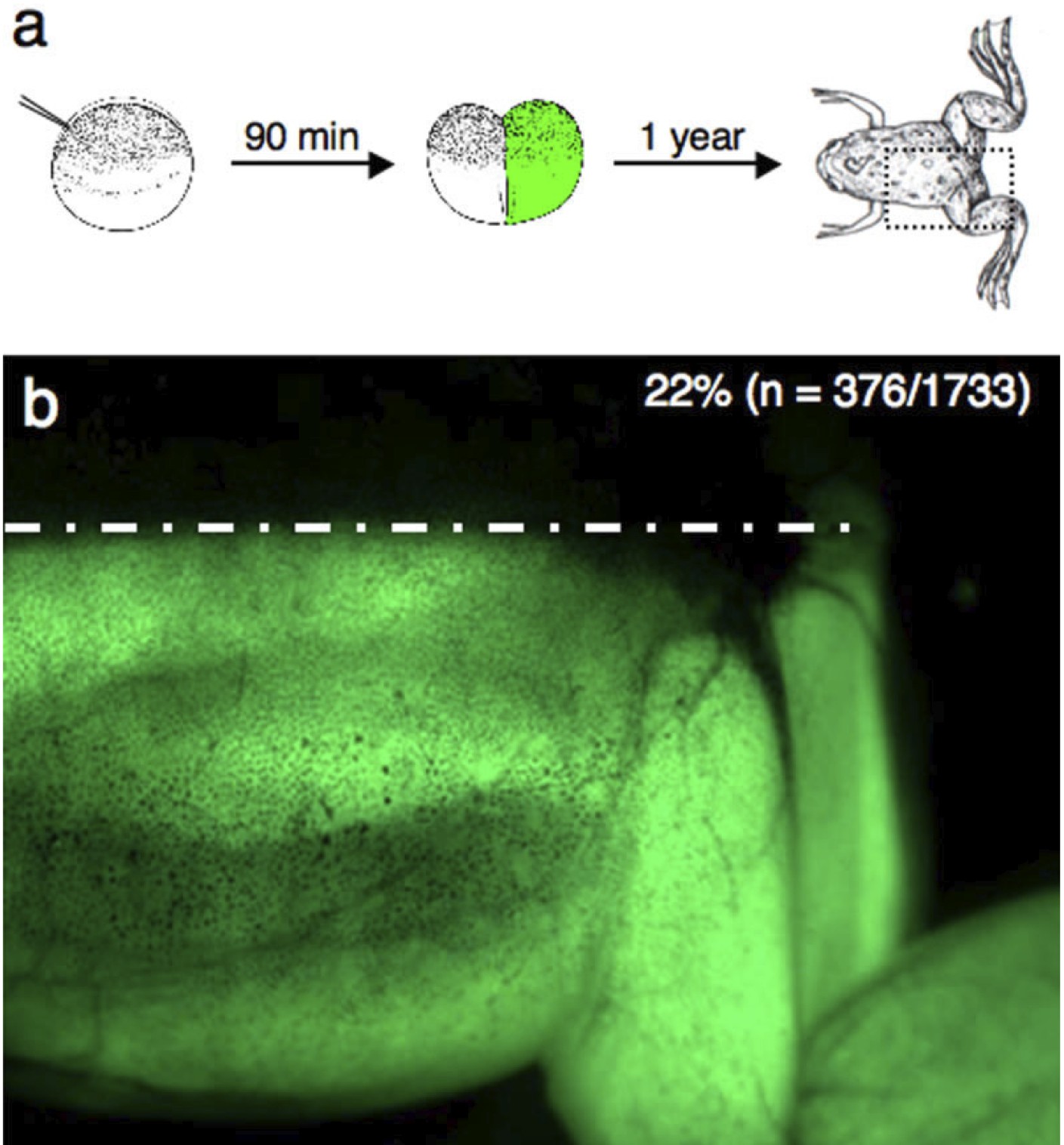 Fig. 1. Injection-mediated Sleeping Beauty trans- genesis in Xenopus. a: Schematic representation of the injection method used to generate the SB transgenic frogs. Xenopus laevis embryos were injected at the one-cell stage with pTGFP plas- mid and mRNA encoding the SB transposase. The cartoon depicts integration of the transposon substrate in one blastomere at the two-cell stage. The resulting embryo is predicted to develop as a “half transgenic” animal. b: “Half transgenic” founder. Green fluorescent protein (GFP) expres- sion in Xenopus laevis founder L2M is restricted to the left side of the dorsal midline (white dashed line). Outcross of this founder, with half of the germline containing the transgene, is predicted to generate GFP-positive F1 progeny at a rate of 25%. The observed rate of GFP transmission in the F1 tadpoles was 22% (n 376/1733).