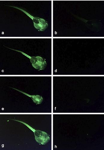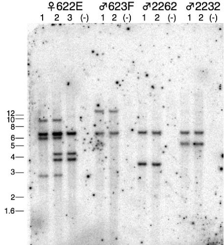 Fig 7. Southern blot analysis of F1 tadpoles from SB11-mediated pT2ÂGFP transgenic Xenopus tropicalis founders. Founder male 622E has two independently segregating insertion events; compare female 622E1 (four green fluorescent protein [GFP] -positive hybridizing bands) and 622E3 (three GFP-positive hybridizing bands). Tadpole female 622E2 has inherited both integration events. F1 progeny from founders male 623F, male 2262, and male 2232 have two GFP-positive hybridizing bands.