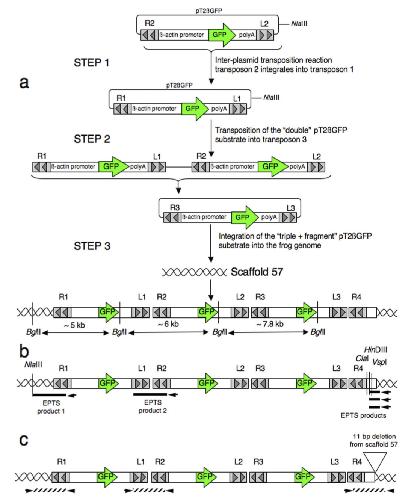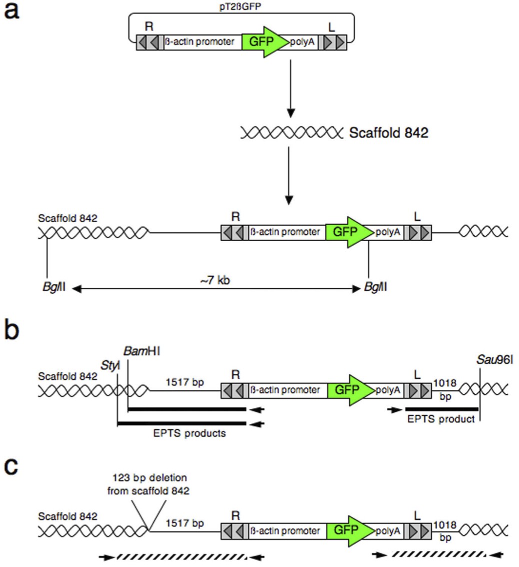 Fig. 8. Schematic of the integration site of the pT2GFP transgene into scaffold 842 for the X. tropicalis 5M founder line (not to scale). a: Integration of a single transposon transgene integrated into scaffold 842 as determined by Southern blot analysis showing a single 7 kb BglII-digested green fluorescent protein (GFP) -positive band. b: Cloning of the flanking genomic sequence by EPTS LM-PCR. EPTS products identified for both the 5 and 3 end of the tranposon are noted. c: Final orientation of the transposon integrated into scaffold 842 for X. tropicalis founder line 5M.