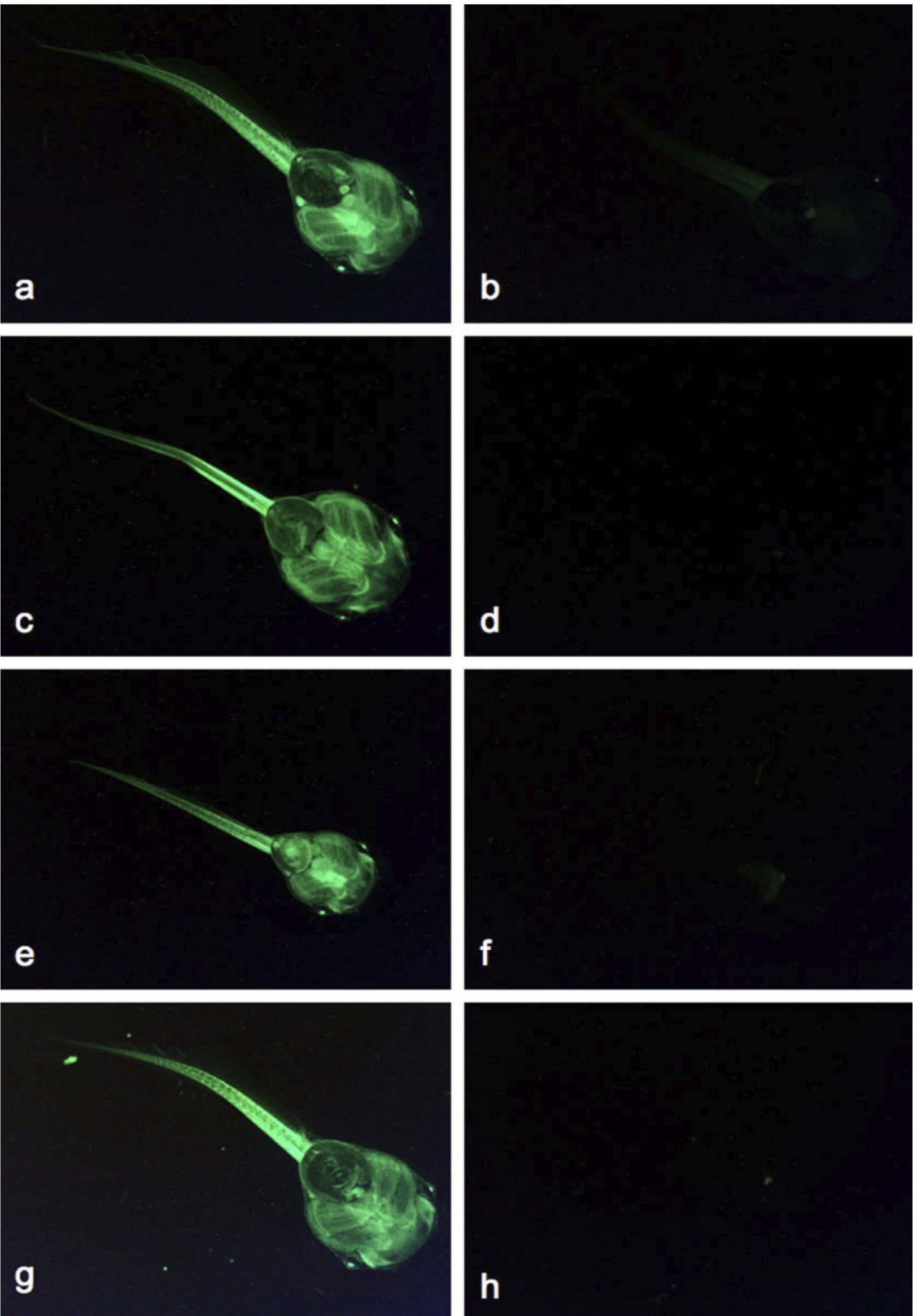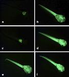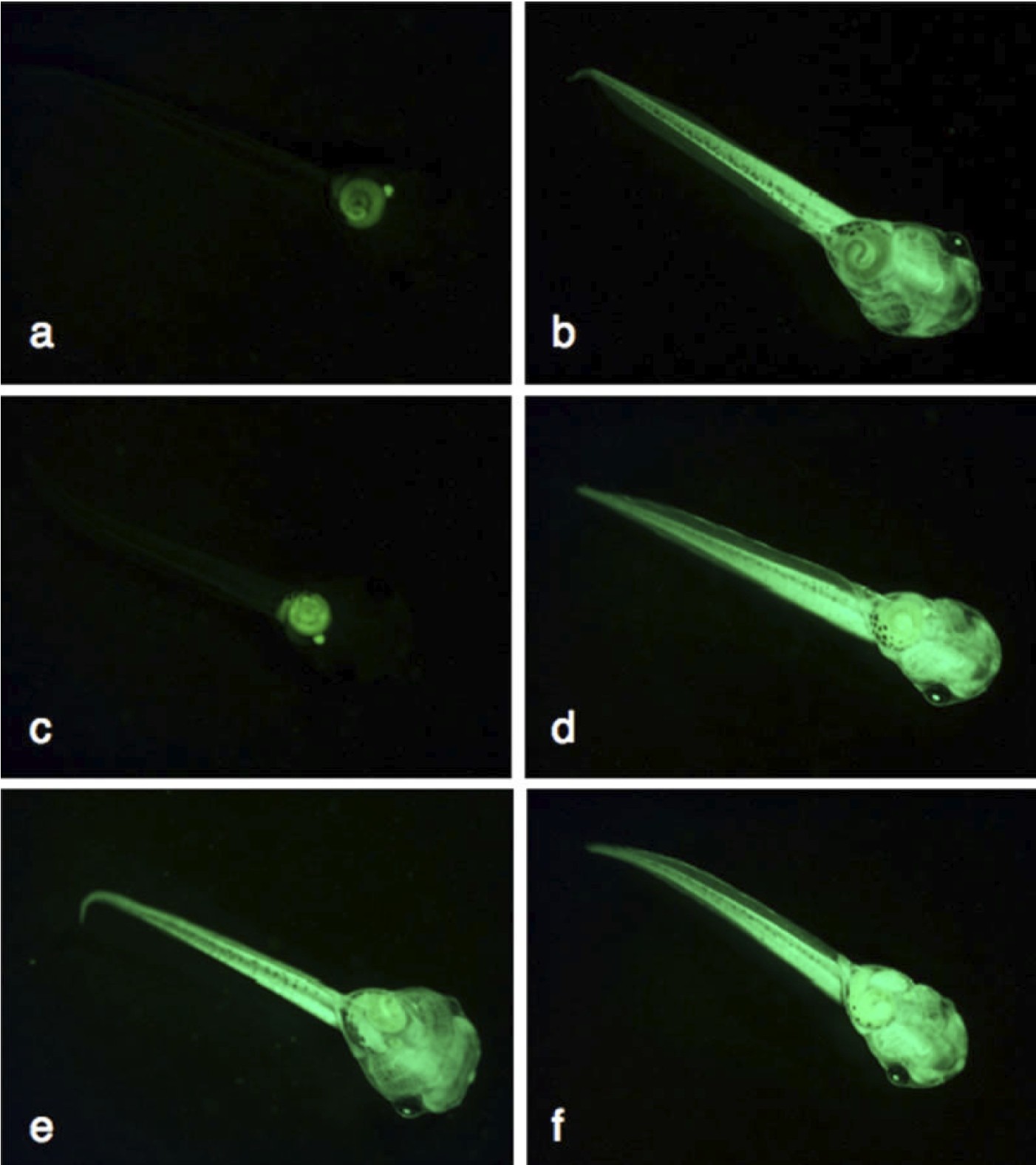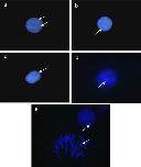 Fig. 4. Fluorescence in situ hybidization (FISH) of cells harvested from pT2GFP transgenic Xenopus tropicalis. Interphase nuclei were prepared from circulating blood cells harvested from individual tadpoles and probed with fluorescein isothiocyanate (FITC) -labeled green fluorescent protein (GFP) for detection. White arrows indicate location of the GFP probe in the samples. a: pT2GFP X. tropicalis founder line 4M. b: pT2GFP founder line 5M. c: pT2GFP founder line 6M. d: pT2GFP founder line 7M. e: Interphase nuclei and metaphase spread of founder line 7M.
