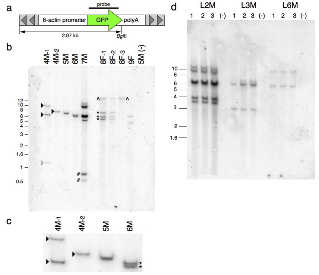 Fig. 3. Southern blot analysis of genomic DNA harvested from SB-mediated transgenic Xenopus tropicalis and Xenopus laevis. Genomic DNA harvested from progeny of each of the founder animals was digested with BglII and separated by electrophoresis on an agarose gel, transferred to a membrane and probed with a radiolabeled green fluorescent protein (GFP) -encoding DNA fragment. a: Schematic representation of the pT2GFP SB transposon indicating the approximate position of the unique BglII site and region used for the probe (bar). Not to scale. b: Southern blot analysis of pT2GFP transgenic founders. Outcross of founder 4M resulted in two discrete hybridization patterns indicating independent segregation of the alleles (compare samples 4M-1 and 4M-2). The founder animal contains, at least, four copies of the GFP sequence that are inherited by the progeny (open and closed triangles). Likewise, the progeny of 8F display two different hybridization patterns (compare 8F-1 and 8F-3). Founder 8F also contains at least four copies of the transgene (carets [!] and asterisks [*]). Progeny from founder 7M have a complex hybridization pattern suggesting the presence of a concatamer of transposon transgenes. Tadpoles 4M-1 and 7M have hybridizing bands (labeled open triangle and #) that migrate faster than the predicted lower limit for the BglII digested transgene (2.97 kb; see Fig. 1a). This indicates that the integration events at these loci are complex and have involved fragmentation of the transposon transgene. Size markers (in kb) are indicated on the left side of the blot. c: Enlarged view of the Southern blot to illustrate that founder 6M has two closely migrating bands (*).d: Southern blot analysis of Xenopus laevis founder lines L2M, L3M and L6M. Genomic DNA samples for three GFP-positive F1 animals (#1, 2, and 3) and a GFP-negative F1 sibling (#4) from each founder line were digested with BglII, separated on a 0.7% (w/v) agarose gel, and probed with a 700-bp GFP fragment as in Figure 3b. L2M founder line has at least five hybridizing GFP bands, L3M has at least three GFP-positive bands, and L6M has two GFP-positive bands.