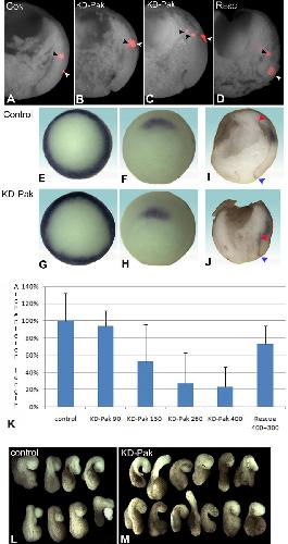 Figure 1. Pak1 inhibition affects movement of the mesendoderm relative to the blastocoel roof (BCR). A-D: DiI (1,1 prime , di-octadecyl-3,3,3 prime ,3 prime ,-tetramethylindo-carbocyanine perchlorate) labeling. Label of an initially (stage 10.5) horizontal streak is shown 2 hr later in sagittally sectioned embryos. A: Control. B,C: KD-Pak1. D: Rescue of KD-Pak1 with wt-Pak1. White arrowheads, initial labeling sites; black arrowheads, positions of mesendoderm after 2 hr. E-J: Pak1 inhibition and region-specific gene expression. Expression of the posterior mesodermal marker Xbra (E,G) and the dorsoanterior mesoderm marker gsc (F,H-J) was compared between control gastrulae (E,F,I) and embryos injected with KD-Pak1 (G,H,J) by in situ hybridization. I,J: Sagittally fractured embryos, dorsal is to the right. Blue arrowhead points to blastopore and red arrowhead points to archenteron. K: Archenteron length, measured (Axiovision) from fractured stage 11 embryos after injection of KD-Pak1 or KD-Pak1 with wt-Pak1 (rescue) mRNAs at doses indicated (pg per blastomere). Each column represents data from 22 embryos from 2-3 batches of eggs. Archenteron length was normalized to water-injected controls. The Welch test confirmed that KD-Pak1 (130 pg) was significantly shorter than control archenterons, at significance level alpha = 0.02; and KD-Pak1 (260 pg, 400 pg and 90 pg) at alpha = 0.005. Likewise, the rescue is significantly higher than KD-Pak1 (400 pg) at alpha = 0.05. L,M: Convergent extension. Explants of dorsal blastopore lip from control (L) and KD-Pak1 (400 pg) -injected embryos (M) stage 10 gastrulae were cultured overnight.