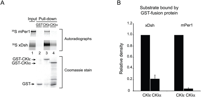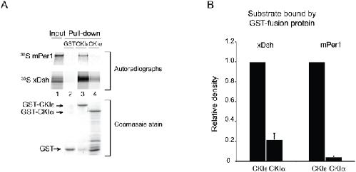 Figure 1. Recombinant CKIε, but not CKIα, interacts with mPer1 and xDsh.(A) GST, GST-CKIε, or GST-CKIα was bound to glutathione sepharose, and then incubated with 35S-labeled mPer1 or xDsh. 10% of the mPer1 input and 25% of the xDsh input are shown. Coomassie stained gel shows the levels of GST fusion protein used for each pull-down. (B) Quantification of three independent experiments. Values are normalized against the amount of protein bound by GST-CKIε, and error bars represent standard deviation of the mean.