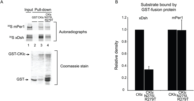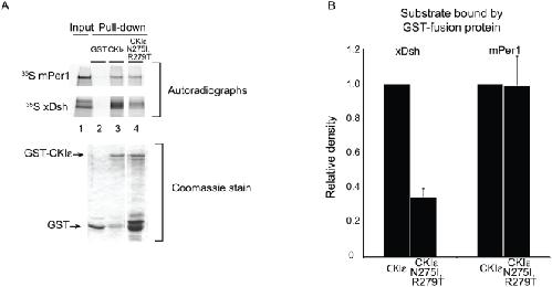 Figure 5. The C-terminal tail enhances binding of xDsh and mPer1 to mutant CKIε.(A) GST, GST-CKIε, or GST-CKIε N275I/R279T was bound to glutathione sepharose and incubated with 35S-labeled xDsh or mPer1. (B) Quantification of three independent experiments. Values are normalized against the amount of protein bound by GST-CKIε.