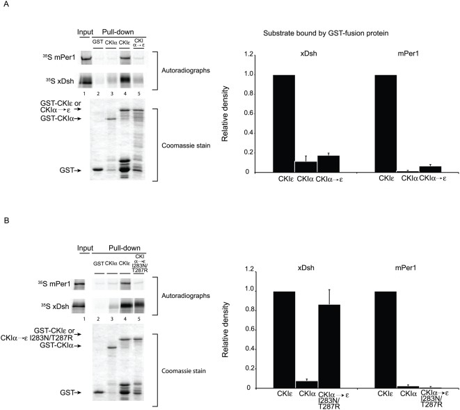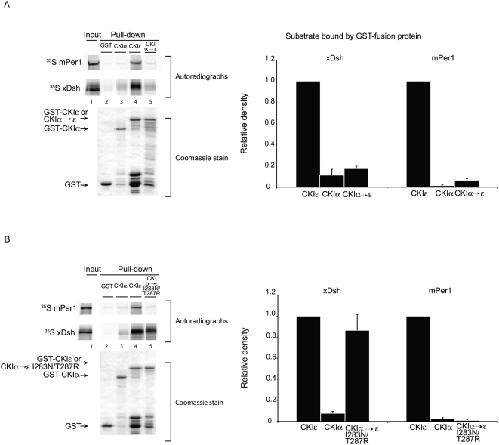 Figure 6. A. Neither xDsh nor mPer1 bind strongly to CKIα→ε.GST, GST-CKIε (partially purified) or GST- CKIα→ε, was bound to glutathione sepharose and incubated with 35S-labeled xDsh or mPer1. (B) GST, GST-CKIε, or GST- CKIα→ε I283N/T287R, was bound to glutathione sepharose and incubated with 35S-labeled xDsh or mPer1. The bar graphs represent quantification of three independent experiments. Values are normalized against the amount of protein bound to GST-CKIε.