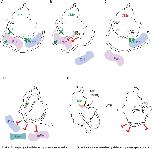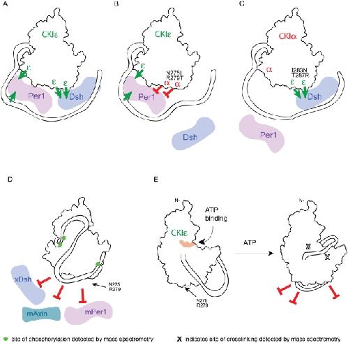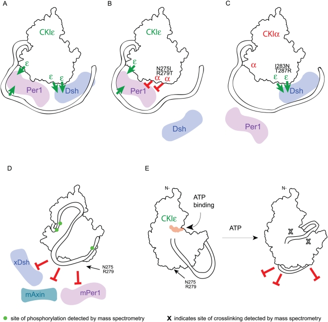 Figure 9. Model of inter- and intra-molecular interactions involving CKIε.Red blocked arrows represent inhibition of binding and green arrows represent positive binding interactions. (A–D) Back face of the kinase. (A) CKIε binds to Dsh and Per using different binding sites. (B) Mutation of CKIε N275 and R279 to the corresponding CKIα identity inhibits Dsh and Per binding; however, the C-terminal tail and at least one other residue in the kinase domain promote Per binding. (C) Changing two residues in CKIα to the CKIε identity along with adding CKIε's C-terminus enables Dsh to bind to CKIα. Per is unable to bind this chimeric kinase. (D) Binding of the autophosphorylated tail to the backside prevents the binding of substrates. Phosphorylated sites detected by mass spectrometry are shown on the tail. (E) View of the front side of the kinase. Left, CKIε's C-terminus is labile when it is not phosphorylated, and CKIε is able to bind to partners. Right, upon incubation with ATP, CKIε autophosphorylates and the C-terminus binds tightly to the back side of the kinase domain. This positions the peptide PEDLDRERREHDREER next to the active site and the phosphate recognition groove. The X's show identified crosslinks between the peptide and the kinase domain.