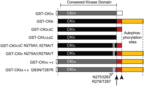 Figure 2. Protein constructs used in this work.CKIα and -ε are shown with their conserved kinase domains in gray and black, respectively (89% similarity, 75% identity). The arrow indicates the position of residue 295 in CKIε, and the non-conserved, charged region of the protein is colored red. The filled arrowhead indicates the position of residue 319, where CKIε is conventionally truncated. The C-terminus contains autophosphorylation sites and is colored yellow. The open arrowhead and white bars indicate the position of residues N275 and R279 (CKIε), and I283 and T287 (CKIα).