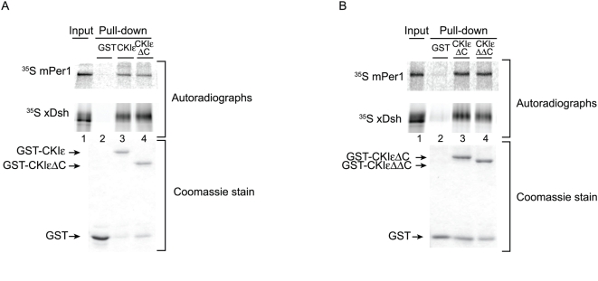 Figure 3. xDsh and mPer1 do not require CKIε's C-terminus for binding.(A, B) Purified GST, GST-CKIε, GST-CKIεΔC or GST-CKIεΔΔC were bound to glutathione sepharose and incubated with 35S-labeled xDsh or mPer1 as indicated.