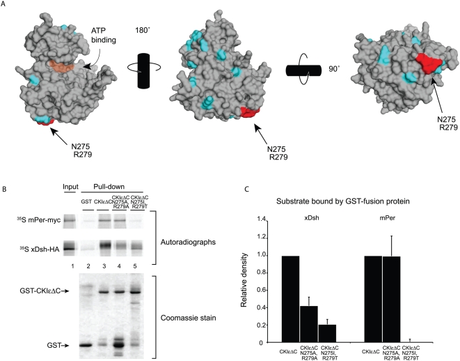 Figure 4. Residues 275 and 279 regulate binding to xDsh and mPer1.(A) Space-filling representation of CKIδ (PDB ID 1CKJ, [50]). Residues shown in cyan and red are conserved between CKIε and CKIδ, but not CKIα. Red residues N275 and R279 are solvent accessible and are chemically distinct in CKIα. Orange shading shows the position of the ATP binding cleft. (B) Binding of 35S-labeled mPer1 and xDsh to GST-CKIεΔC, GST-CKIεΔC N275A/R279A, or GST-CKIεΔC N275I/R279T was performed. (C) Quantification of three independent experiments. Values are normalized against the amount of protein bound by GST-CKIεΔC.