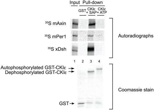 Figure 7. Autophosphorylation of CKIε inhibits binding by substrate and scaffolding proteins.Purified GST and GST-fusion proteins were bound to glutathione sepharose and bound GST-CKIε was incubated with SAP or ATP for 1 hour. Resin was incubated with 35S-Methionine-labeled xDsh, mAxin or mPer1. 10% of the mPer1and mAxin input and 25% of the xDsh input were run. Coomassie stained gel shows the levels of GST fusion protein used for each pull-down.
