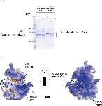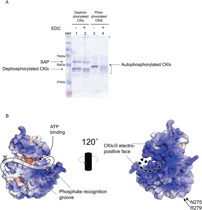 Figure 8. Analysis of the binding of the C-terminal tail.(A) Full-length CKIε was incubated with either SAP or ATP prior to reaction with the EDC crosslinker. Lane 2 shows that there is no change in the apparent molecular weight of dephosphorylated CKIε. In lane 4, there is marked change in the migration of autophosphorylated, crosslinked CKIε (bracketed). Asterisk shows a high molecular weight species that may correspond to SAP-CKIε oligomers (lane 2). (B) Space-filling models of CKIδ are shown. The APBS plugin for PyMol (DeLano Scientific LLC) was used to establish electrostatic potential of solvent exposed atoms. Positively charged areas are shaded blue and correspond to basic regions of the protein; negatively charged regions are red, and correspond to acidic areas. The highly basic groove that has been postulated to be a phosphate recognition region is conservered across the CKI family. The two identified cross-linked residues are indicated with an X. The cartoon line on the left side diagram shows the position of the first 20 amino acids of the tail based on the crosslinking data. The dotted line on the right side shows the proposed extension of the tail onto the backside of the kinase.