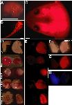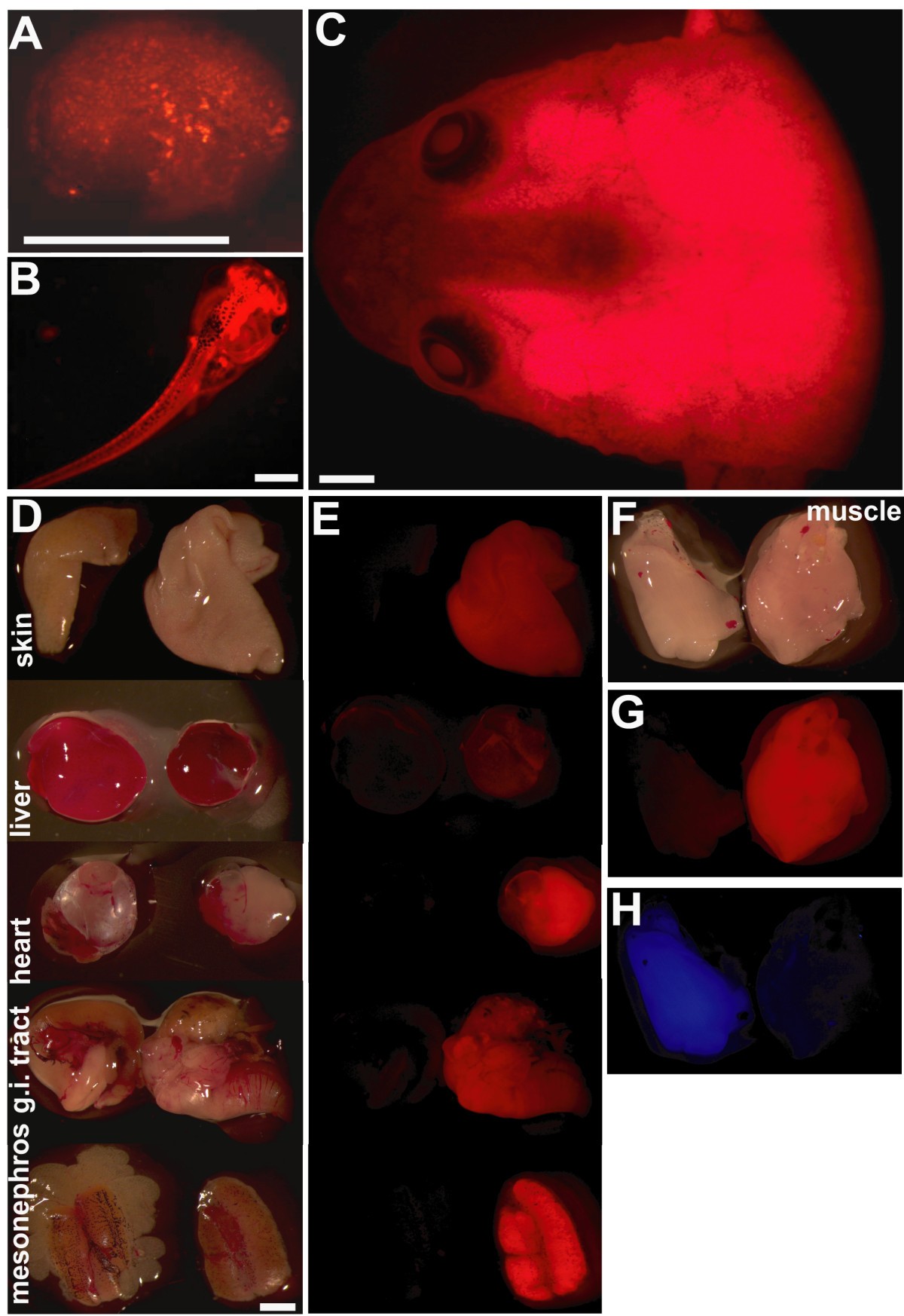 Figure 1. Transgenic Xenopus laevis strain expressing ubiquitous red fluorescence. F1 animals of the tom3 strain at the neurula (A), larval (B) or froglet stage (C) seen with the red fluorescence filter set. D: Isolated tissue of a control froglet (left) and a froglet of the tom3 strain (right) seen in normal light. E: Same tissue samples seen in the red fluorescence filter set. F-H: Isolated muscle of a froglet of the blue fluorescent C5 strain [5] (left) and of the red fluorescent tom3 strain (right) seen in normal light (F), with red fluorescence filter set (G), or blue fluorescence filter set (H). Scale bars equal 1 mm.