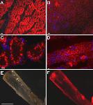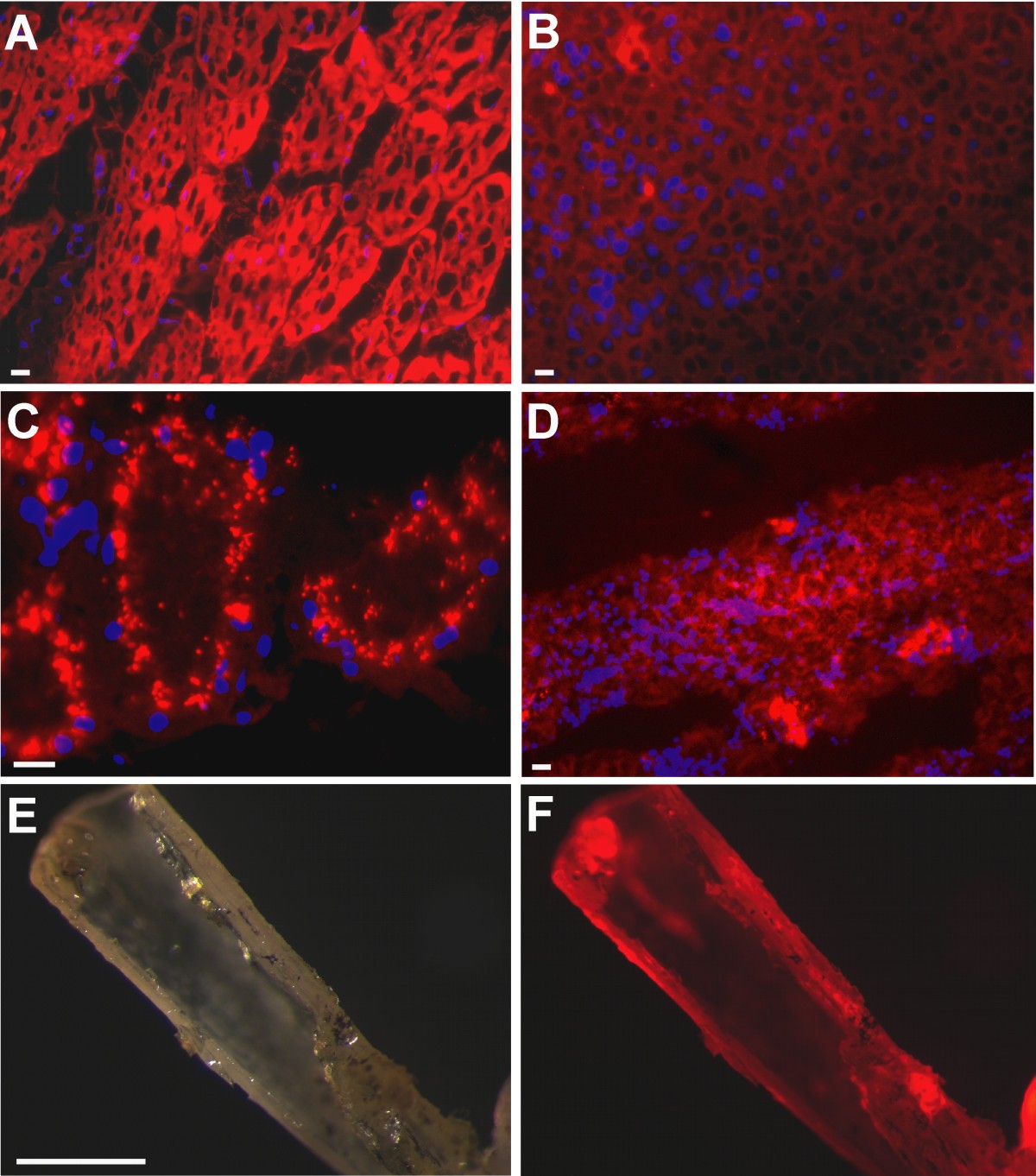 Figure 2. Adult animals of the tom3 strain express red fluorescence in a variety of tissues. A-D: Cryosections (10 μm) were counterstained with DAPI after methanol fixation (20 min.) to visualize cell nuclei. Overlays were done with AxioVision software using false colours. Note: Due to fixation endogenous red fluorescence as well as the tissue structure suffered. Sections were made from limbmuscle (A), heart (B), kidney (C) and liver (D). E-F: Macrosection of a limbbone seen in normal light (E) or with red fluorescence filter set (F). Scale bars equal 10 μm (A-D) or 1 mm (E-F).