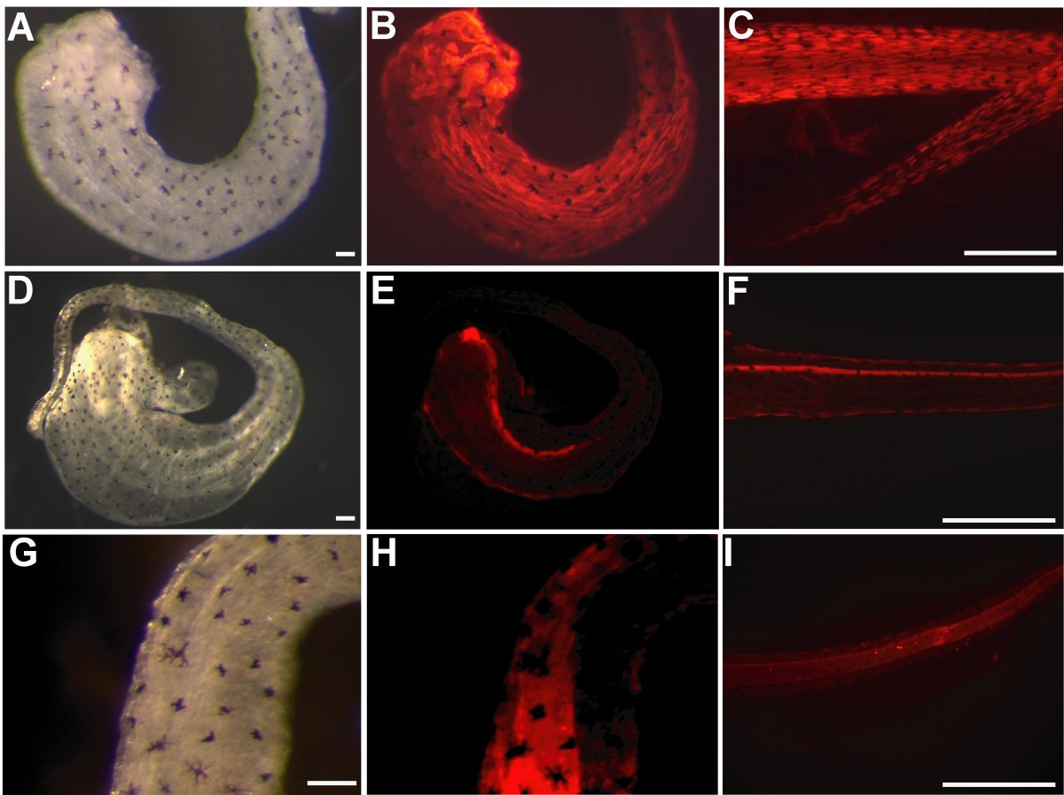 Figure 4. Tissue identity of blastema derived ectopic tails. 21 days old ectopic tails or control regenerates (C,F,I) were isolated and immunostained with specific antibodies directed against muscle cells (12/101)(A-C), neuronal cells (Xen-1)(D-F) or notochord (anti-Coll-2)(G-I). Scale bars equal 100 μm in A, D, G or 1 mm in C, F, I. Note, that the red fluorescence reflects the Cy3 labelled secondary antibody exclusively, as the red fluorescence of the tdTomato protein is destroyed by the fixation used for immunostaining.