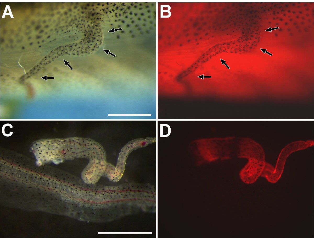 Figure 5. Contribution of the host animal to blastema derived ectopic tails. 24 hours old blastemas obtained after tail amputation of stage 50 wild type tadpoles were transplanted into hosts of the tom3 strain. After 21 days tadpoles were investigated. A-B: Tail like outgrowth in the trunk shown in the bright field (A) or with red fluorescence filter set (B). C-D: Isolated ectopic tail (upper structure) together with wild type tail shown in normal light (C) or with red fluorescence filter set (D). Scale bars equal 1 mm. The arrows mark the tail-like outgrowth.