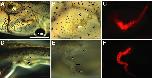 Figure 3. Ectopic tail formation after blastema transplantation. 24 hours old blastemas obtained after tail amputation of stage 50 tadpoles of the tom3 strain were transplanted into wild type hosts of the same stage. After 21 days tadpoles were investigated. A-C: Tail like outgrowth in the head region: B: close-up C: red fluorescence filter set. D-F: Tail like outgrowth in the trunk: E: close-up F: red fluorescence filter set. Scale bars equal 1 mm expect in B 100 μm. The arrows mark the tail-like outgrowth.