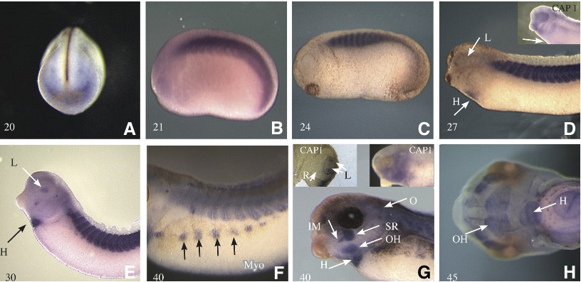 Fig. 3. Riboprobe wholemount in situ hybridization in Xenopus embryos. CAP2 is expressed along the paraxial mesoderm and in the region where the stomadeal pocket and cement glad will form (A). Subsequently, the paraxial mesoderm begins to segment (B) and cranio- facial expression drops off as somites differentiate (C). There is a brief period of expression in lens (white arrow) at stage 27, and in the heart (H) primordia (D). By stage 27, heart (H) expression is well established, and remains breifly de- tectable in the lens (L) (E). In contrast, at these stages CAP1 is ex- pressed in periocular mesencyme, lens, sensorial ectoderm and branchial arch (D insert). At later stages, CAP2 is expressed in the precursors to striated muscle including the myotome (Myo) (F), and in the developing heart (H), otic vesicle (O), musculus intermandibularis (IM), musculus orbitohyoidis (OH), and musculus subacuales rectis (SR) (G). At this stage, CAP2 is expressed in the retina, but CAP1 is not, although there is an annular domain of CAP1 expression around the circumference of the developing lens (G left insert). CAP1 is expressed in branchial arches but not in retina (compare G with CAP1 right insert). Expression seems to diminish when the muscles differentiate to the point of displaying visible striations (compare OH and Heart in G vs. H). Embryonic stages are indicated in the lower left corner of each photograph, and bars with numbers represent scale in micrometers.