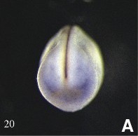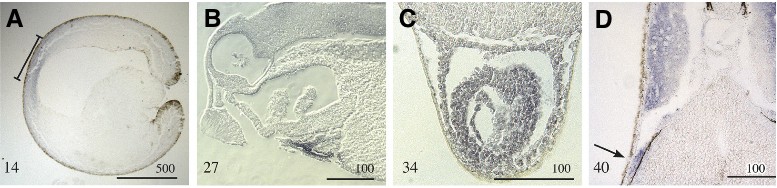 Fig. 4. Expression of CAP2 in sectioned embryos. The anterior end of the embryo displays staining in the region that ultimately generates the cement gland (bracket) (A). At later stages, expression is up- regulated in presumptive heart (B), and expresses predominantly in the mesodermally derived tissues of this organ when it forms a tube (C). CAP2 expressing myotome migrates ventrally and around the flank from the somites (D).