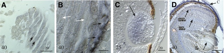 Fig. 5. Expression of CAP2 in sectioned muscle and eye. CAP2 is also expressed in the myoblasts as they aggregate and fuse into tubes (arrows) (A), but transcription begins to diminish when the muscle fibers have differentiated sufficiently to show striations (compare relatively undifferentiated dark arrow with striated white arrows (B). Expression in lens (L) is evident in the domain of forming lens fibers (see arrow in (C)), but it disappears rapidly thereafter whereupon the outer and inner plexiform layers (OPL and IPL, respectively) of the retina, as well as the chorion (C) transcribe the gene (D).
