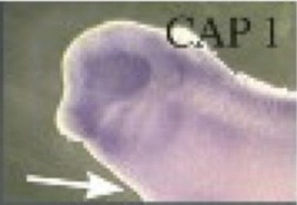 cap1 (CAP, adenylate cyclase-associated protein, 1) gene expression in Xenopus laevis embryos, NF stage 27, as assayed by in situ hybridization, lateral view, dorsal up, anterior left.