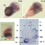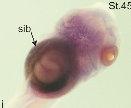 Figure 6 D. Spatial expression profile of enpp1, 4, 6 and 7 during development.Whole-mount in situ hybridisation analysis of enpp7 expression. Ventral view of stage 45 embryos hybridized with anti-sense (i) and sense (ii) probe, lateral view of the gut region of a stage 45 embryo (iii), cryostat section (iv) at 28μm of a stage 45 embryo through the gut. no, notochord; m, muscles; sc, spinal cord; sia, first sections of the small intestine; sib, external coil of small intestine; sic, internal coil of small intestine (from Chalmers and Slack, 1998).