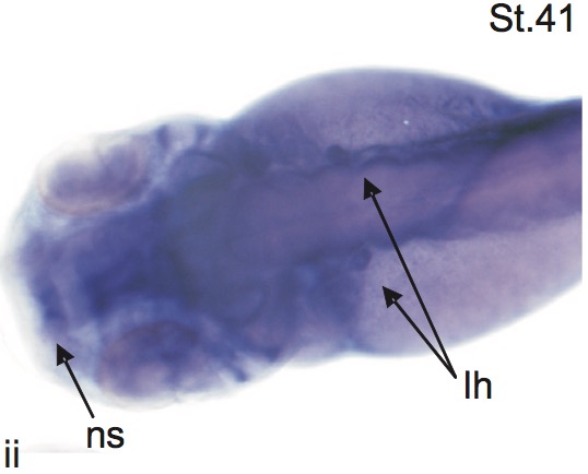 Nasal or olfactory placode (ns) and lymph hearts (left and right) (lh) are visible in this dorsal view of a NF stage 41 X. laevis tadpole, visualised via in situ hybridization for expression of enpp2a (ectonucleotide pyrophosphatase/phosphodiesterase 2).