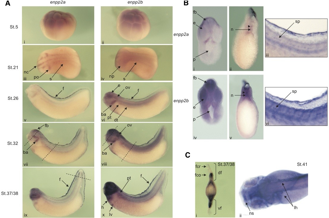 Fig. 7. Comparison of the spatial expression profile of enpp2a [enpp2.S] and enpp2b [enpp2.L] genes during development. (A) Whole-mount in situ hybridisation with an enpp2a and enpp2b DIG labelled anti-sense RNA probe was performed on embryos from stages 5-41. Animal view at stage 5 (i, ii). Lateral view at stage 21 (iii, iv), stage 26 (v, vi), stage 32 (vii, viii) and stage 37/38 (ix, x). Dorsal is up and anterior is left. The dotted line through the fins (ix) corresponds to plane of section in Ci. (B) Whole-mount in situ hybridisation with an enpp2a and enpp2b DIG labelled antisense RNA probe on stage 32 embryos. Transverse section through the head (i, iv) and trunk (ii, v) levels. Lateral view of the trunk region (iii, vi). Arrowheads indicate the staining in the spinal cord. (C) Whole-mount in situ hybridisation with an enpp2a DIG labelled antisense RNA probe. Transverse section through the fin at stage 37/38 (i). Dorsal view of a stage 41 cleared embryo (ii). ba, branchial arches; df, dorsal fin; dt, distal tubules; e, eye; f, fin; fb, forebrain; fcr, fin crest; fco, fin core; h, heart; lh, lymphatic heart; lv, liver diverticulum; n, notochord; nc, neural crest; np, neural plate; ns, nasal placode; ov, otic vesicle; p, pharynx; pt, pronephric tubules; s, somites; sp, spinal cord; vf, ventral fin.
