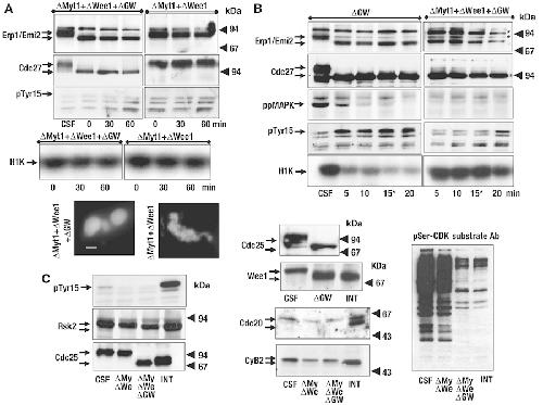 GW depletion induces mitotic exit in CSF extracts in the presence of high cyclin B–Cdc2 activity. (A) A triple depletion with Myt1–Wee1–GW antibodies or Myt1–Wee1–Control antibodies were carried out in CSF extracts and the phosphorylation of the indicated proteins, as well as the cyclin B–Cdc2 activity and chromatin condensation were analysed. (B) CSF extracts were immunoprecipitated twice with control antibodies or with anti-Myt1 and anti-Wee1 antibodies. Subsequently, anti-GW antibody-bound Dynabeads were added to the supernatants and samples were removed at the indicated times. * Time-point 0 min in GW immunodepletions of Figure 1 corresponds to time-point 15 min of this figure. (C) Supernatants of GW, Myt1–Wee1 or Myt1–Wee1–GW immunoprecipitates were used to analyse the phosphorylation of the indicated proteins using western blot. Bar 5 μm.