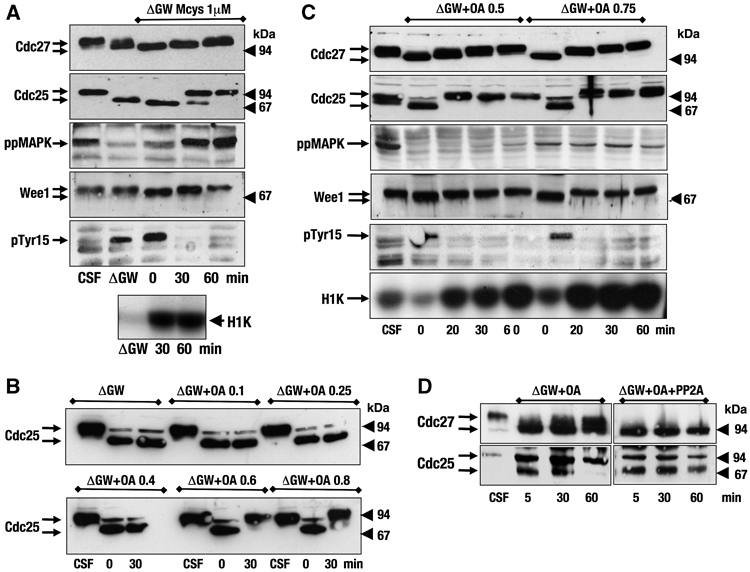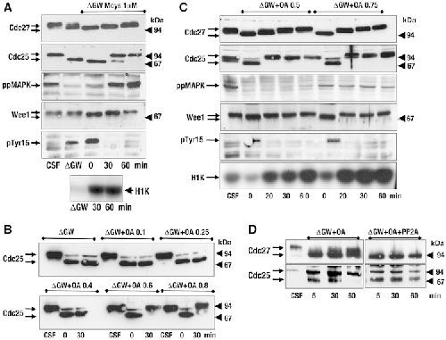 Phosphatase inhibitors, microcystin and okadaic acid (OA), rescue the phenotype induced by GW inactivation in CSF extracts. (A) GW-depleted CSF extracts were supplemented with microcystin (1 μM) and the phosphorylation of the indicated proteins as well as the cyclin B–Cdc2 activity were analysed. (B) CSF extracts were devoid of GW and supplemented with increasing doses of OA (from 0.1 to 0.8 μM). (C) GW-depleted CSF extracts were supplemented with 0.5 or 0.75 μM OA. (D) GW-depleted CSF extracts were supplemented with 0.75 μM OA and subsequently supplemented or not with purified PP2A (Upstate).