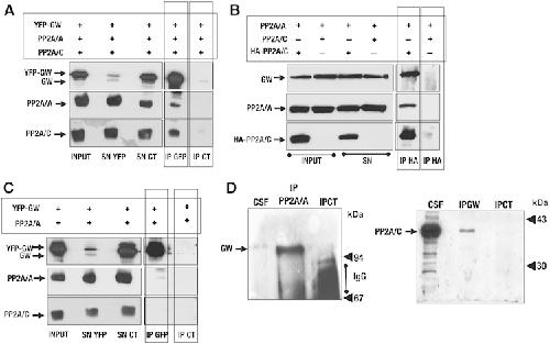 PP2A binds GW in human cells and CSF extracts. (A) HEK293 cells were co-transfected with YFP-GW, PP2A/A subunit and PP2A/C subunit. Cells were then lysed and immunoprecipitated with anti-GFP antibodies or with control antibodies. The presence of GW, PP2A/A and PP2A/C in 40 ng of total protein of the input and the supernatant, as well as the IP corresponding to 500 μg of total protein were analysed by SDS–PAGE and western blot. (B) HEK293 cells were co-transfected with PP2A/A and either PP2A/C or HA-PP2A/C and immunoprecipitated with anti-HA antibodies. The presence of GW, PP2A/A and PP2A/C was then analysed in the inputs, the supernatants and the Ips. (C) HEK293 cells were co-transfected with YFP-GW and PP2A/A subunit, lysed and immunoprecipitated with anti-GFP or control antibodies as described in Material and methods section. The presence of GW, PP2A/A and PP2A/C was then analysed in the inputs and supernatants by SDS–PAGE and western blot. (D) A total of 50 μl CSF extracts were immunoprecipitated with anti-PP2A/A monoclonal antibodies (6F9) or control antibodies, and the immunoprecipitates as well as a 1.5-μl CSF sample were used to analyse the presence of GW by immunoblotting. The smeared bands present in control IP between 94 and 67 kDa correspond to immunoglobulins in which the heavy and light chains have not been correctly dissociated after boiling. The same amount of CSF extracts were used to immunoprecipitate GW with anti-GW or control antibodies, and the immunoprecipitates as well as a 1.5-μl CSF sample were treated as described above to analyse the presence of PP2A/C.