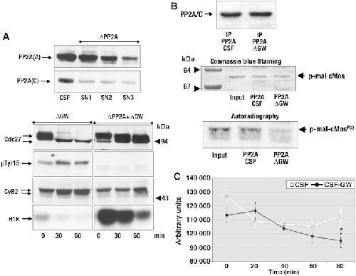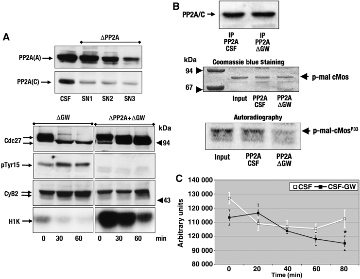 GW maintains the mitotic state by promoting PP2A inhibition. (A) CSF extract was incubated with anti-PP2A/A monoclonal antibodies bound to protein G–Sepharose beads. Three runs of immunodepletion were carried out to remove PP2A. The last supernatant was then depleted of GW by a subsequent immunoprecipitation and used to analyse the phophorylation of Cdc27, Cdc2 and cyclin B2 and to measure cyclin B–Cdc2 activity. The levels of PP2A/A and C were also examined in the three supernatants recovered after PP2A/A immunoprecipitation. (B) Radiolabelled p-mal-cMos was incubated with a PP2A complex obtained from CSF (PP2A CSF) or GW-depleted CSF extracts (PP2A Δ GW). After 1-h incubation, the supernatants were submitted to SDS–PAGE, stained with Coomassie Blue and the phosphorylation of p-mal-cMos revealed by autoradiography. One-tenth of the PP2A immunoprecipitates from CSF (IP PP2A CSF) and GW-depleted CSF extracts (IP PP2A ΔGW) were used to measure the amount of PP2A/C immunoprecipitated in each condition by western blotting. Coomassie Blue staining showing the levels of phosphorylated p-mal-cMos, as well as a scan of this gel using Typhoon Scanner, from the input (10 μl p-mal-cMosp33) and the supernatant of the dephosphorylation reactions with PP2A from CSF (PP2A CSF) and GW-depleted CSF extracts (PP2A ΔGW) are shown. (C) A procedure similar to that followed in (B) except that supernatants were taken at 0, 20, 40, 60 and 80 min of incubation. The gels were scanned using a Typhoon Scanner and quantified by using ImageQuant TL software. Statistical analysis of the results, obtained from three different independent experiments, was performed using unpaired Student's t test. The amounts of phosphorylated p-mal-cMos present at each time were expressed as mean±s.e.m. Statistical difference in the last time point is indicated by an asterisk (*) P<0.0212.