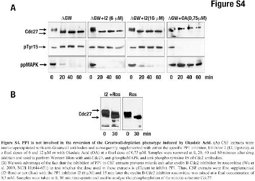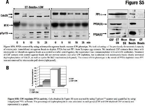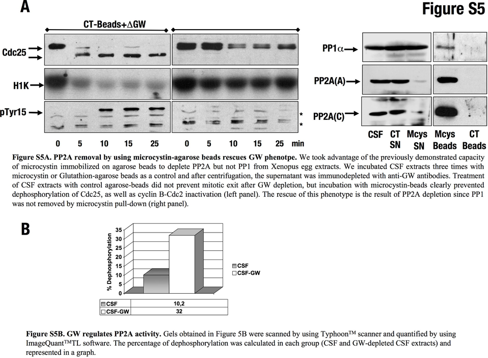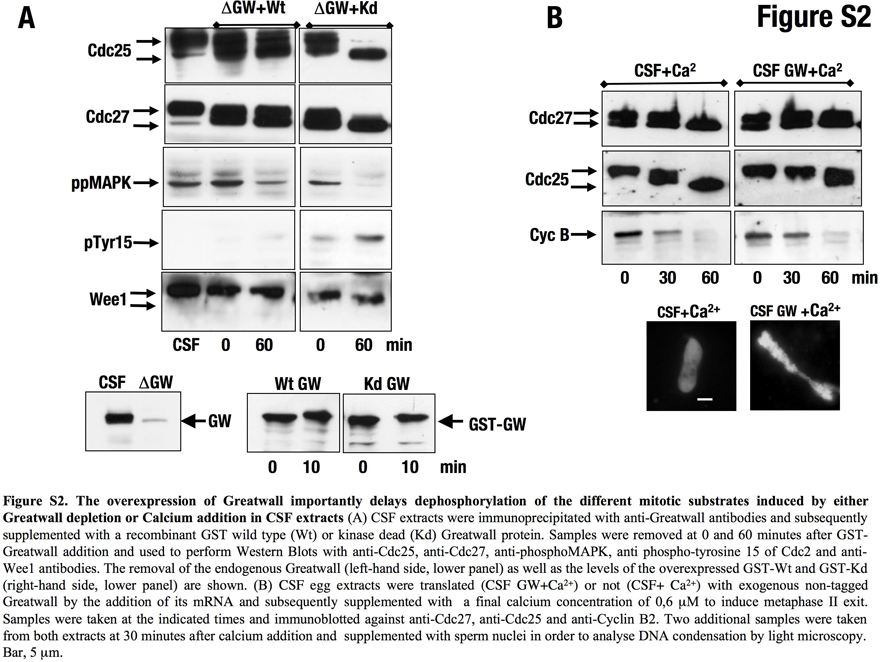 ???displayArticle.abstract??? Greatwall (GW) is a new kinase that has an important function in the activation and the maintenance of cyclin B-Cdc2 activity. Although the mechanism by which it induces this effect is unknown, it has been suggested that GW could maintain cyclin B-Cdc2 activity by regulating its activation loop. Using Xenopus egg extracts, we show that GW depletion promotes mitotic exit, even in the presence of a high cyclin B-Cdc2 activity by inducing dephosphorylation of mitotic substrates. These results indicate that GW does not maintain the mitotic state by regulating the cyclin B-Cdc2 activation loop but by regulating a phosphatase. This phosphatase is PP2A; we show that (1) PP2A binds GW, (2) the inhibition or the specific depletion of this phosphatase from mitotic extracts rescues the phenotype induced by GW inactivation and (3) the PP2A-dependent dephosphorylation of cyclin B-Cdc2 substrates is increased in GW-depleted Xenopus egg extracts. These results suggest that mitotic entry and maintenance is not only mediated by the activation of cyclin B-Cdc2 but also by the regulation of PP2A by GW.