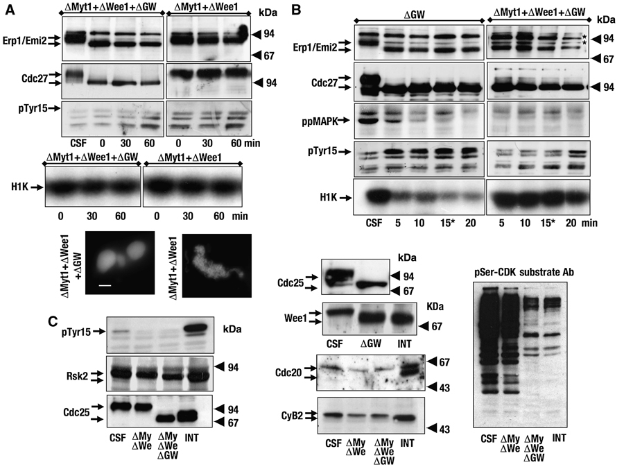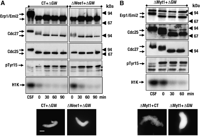 Co-depletion of GW with Wee1 or Myt1 does not prevent mitotic exit. (A) CSF extracts were co-depleted with control (CT) or anti-Wee1 (ΔWee1) and anti-GW (ΔGW) antibodies. Phosphorylation of the indicated proteins was analysed by western blot. Cyclin B–Cdc2 activity was measured by H1 histone phosphorylation assay (H1K). Finally, chromatin condensation was visualized by light microscopy. Asterisks denote non-specific bands of anti-pTyr 15 antibody. (B) Similar to (A) except that the depletion of Myt1 (ΔMyt1) was studied instead that of Wee1 before GW immunoprecipitation. Bar, 5 μm.