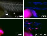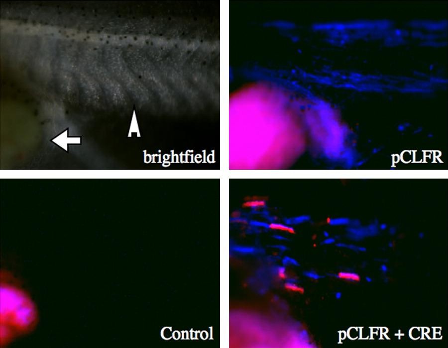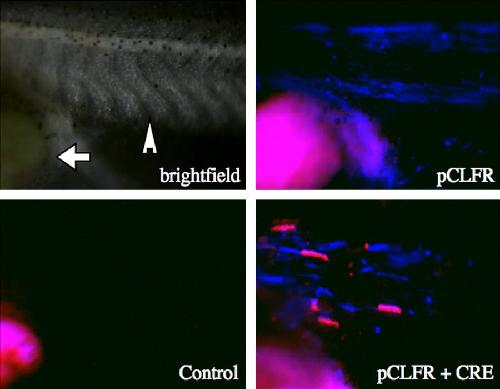 Figure 6. Transgenic expression of Cre in pCLFR-SceI induces blue to red conversion. Meganuclease transgenesis procedure was performed with co-injection of pCSCRE2 lacking SceI sites to allow mosaic expression of Cre. Brightfield image shows mid-section of tadpole with portions of abdomen (arrow) and tail (arrow head) representing region of tadpole shown in all panels. Control tadpole lacks transgenic fluorescence and only autofluorescent yolk is seen. The pCLFR-SceI tadpole shows blue only, whereas mosaic transgenic expression of Cre resulted in several cells showing red fluorescence indicative of Cre-mediated switch from CFP to DsRed2 expression. CFP, cyan fluorescent protein; DsRed2, Discosoma sp red fluorescent protein.