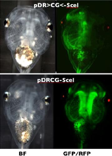 Figure 2. Exemplar tadpole fluorescence patterns. Top: Tadpole injected with pDR>CG<-SceI is fully transgenic for CRY:DsRed1 cassette and half transgenic for CMV:GFP cassette. See text for alternate possibilities. Bottom: Tadpole fully transgenic for pDRCG- SceI. BF, brightfield image; GFP/RFP, merged image from green and red filter sets. CMV, cytomegalovirus ubiquitous promoter; CRY, gamma crystallin lens-specific promoter; DsRed, Discosoma sp red fluorescent protein; GFP, green fluorescent protein.Download figure to PowerPoint