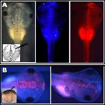 Figure 5. Lineage tracing by means of Cre mRNA injection into pCLFR-SceI transgenic embryos. A,B: Cre mRNA was injected into one cell of two-cell stage embryos (A) or the A1 blastomeres of the 32-cell stage embryo (B). A: Brightfield, CFP, and RFP images show half of the body is exclusively blue, and the other half is mostly red with a few blue cells. The replacement of blue by red fluorescence is particularly evident in brain and tail. B: Two examples of tadpoles showing results when both (left) or just one (right) A1 blastomere was injected with Cre mRNA. Intestine contains yolk autofluorescent in both filter sets. Insets show diagrams of injections. CFP, cyan fluorescent protein; RFP, red fluorescent protein.Download figure to PowerPoint