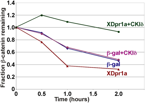 Figure 5. Unphosphorylated XDpr1a promotes, but CKIδ-phosphorylated XDpr1a blocks, β-catenin degradation.Myc:XDpr1a was added to an in vitro β-catenin degradation assay after preincubation with or without CKIδ followed by anti-Myc immunoprecipitation. β-galactosidase preincubated with or without CKIδ was used as a control. Untreated XDpr1a promoted β-catenin degradation, whereas XDpr1a preincubated with CKIδ blocked β-catenin degradation. The data shown represent assays repeated six times.