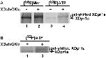 Figure 2. XDsh promotes the phosphorylation of XDpr1a by CKIδ both in vitro and in vivo.A. XDsh induces a CKIδ-mediated phosphorylation of XDpr1a in vitro. Phosphorylation reactions were carried out in the presence of [35S]methionine-XDpr1a (lanes 1 and 2) or [γ-33P]ATP (lanes 3 and 4) and in the absence (lanes 1 and 3) or presence (lanes 2 and 4) of XDsh and CKIδ. Lanes 3 and 4 contain the immunopellet from an anti-Myc immunoprecipiation of [γ-33P]ATP-labeled Myc:XDpr1a. XDpr1a undergoes a gel-shift and shows increased incorporation of [γ-33P]ATP in the presence of XDsh and CKIδ. B. CKIε phosphorylates XDpr1a in vivo. HEK293 cells transfected with Flag:XDpr1a alone or with CKIε and XDsh were metabolically labeled with [32P]orthophosphoric acid prior to XDpr1a immunoprecipitation with anti-Flag antibodies. The cotransfection of CKIε and XDsh with XDpr1a induces a gel-shift and increases [32P]orthophosphoric acid incorporation into XDpr1a. This result is representative of experiments repeated three times with similar results.