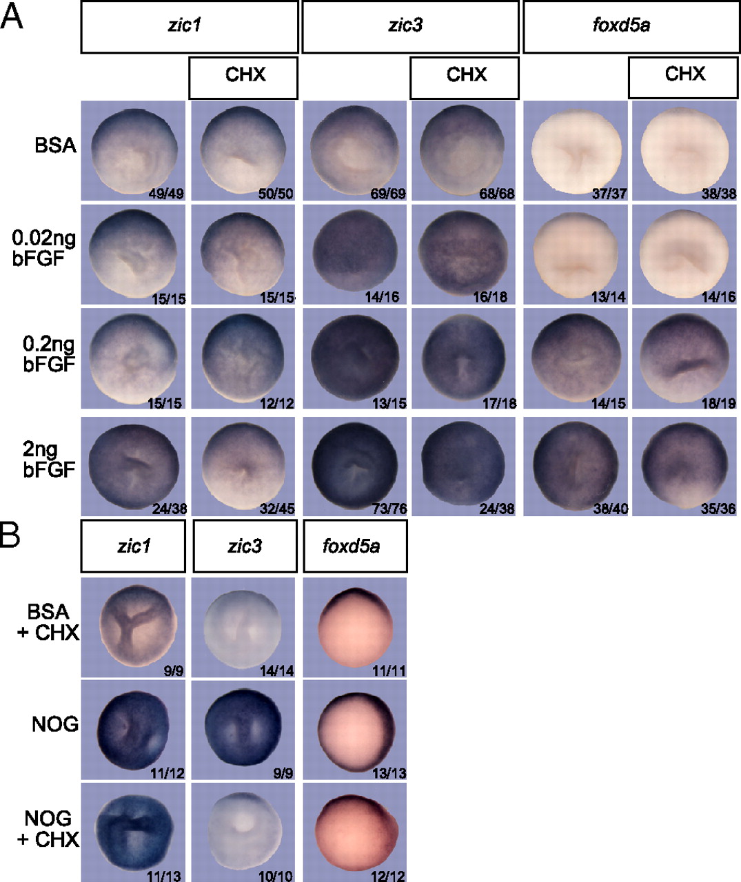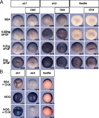 Fig. 3. zic3 and foxD5a are directs targets of FGF signaling, whereas zic1 is a direct target of BMP inhibition. (A) Animal views of stage 11.5 embryos injected at stage 10.5 in the blastocele with 40 ng BSA alone or combined with increasing amounts of bFGF protein, and treated with 10 μg/mL CHX or untreated. (B) Stage 8.5 embryos were injected in the blastocele with 40 ng BSA alone or combined with 36 ng Noggin protein in the presence or absence of CHX, and analyzed at stage 10. Animal views are shown for zic1 and zic3, vegetal views for foxD5a.