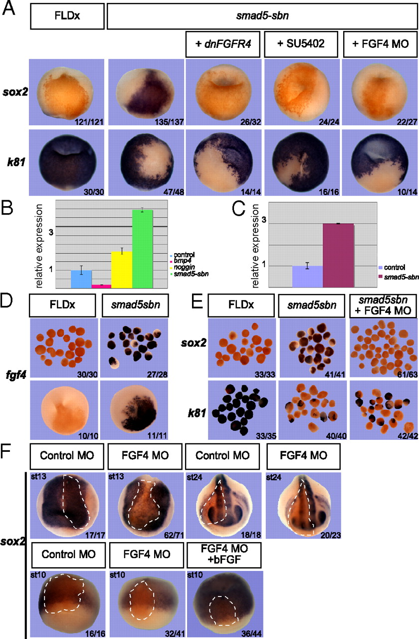 Fig. 1. In vivo neural induction by Smad5-sbn requires FGF activity. (A) Ventral views of stage 13 embryos injected at 16-cell stage in one AB4 blastomere with 2.5 ng FLDx alone or with 3 ng smad5-sbn mRNA, 1 ng dnFGFR4 mRNA, 23 ng FGF4 MO, or treated with 200 μM SU5402, as indicated. In this and the following figures, the orange staining reveals the presence of the lineage tracer FLDx. (B) Quantitative RT-PCR analysis of FGF4 expression at stage 10.5 of embryos injected in all cells at 4-cell stage with 1 ng/blastomerebmp4 mRNA, 1 ng/blastomerenoggin mRNA, or 3 ng/blastomere smad5-sbn mRNA. For this and all following quantitative RT-PCR graphs, expression levels were normalized to levels of ornithine decarboxylase (ODC). (C) Quantitative RT-PCR analysis of FGF4 expression at stage 10 of animal caps taken at late blastula stage from embryos injected animally in all cells at 4-cell stage with FLDx alone or with 3 ng/blastomere smad5-sbn mRNA. (D) Top: Animal caps as in C. Bottom: Ventral views of stage 10 embryos injected with FLDx alone or with 3 ng smad5-sbn mRNA in AB4 at 16-cell stage. (E) Stage 13 animal caps taken at late blastula stage from embryos injected as in C, in the presence or absence of 23 ng/blastomereFGF4 MO. (F) Dorsal views of stage 10, stage 13, and stage 24 embryos injected marginally with 46 ng control MO or 46 ng FGF4 MO in one dorsal cell at 4-cell stage. The injected region is circled with a white dotted line. For the rescue assay, 350 pg of recombinant bFGF protein was injected in the blastocele at stage 8. In this and the following figures, the number of embryos or caps exemplified by the photograph over the total number analyzed is displayed.