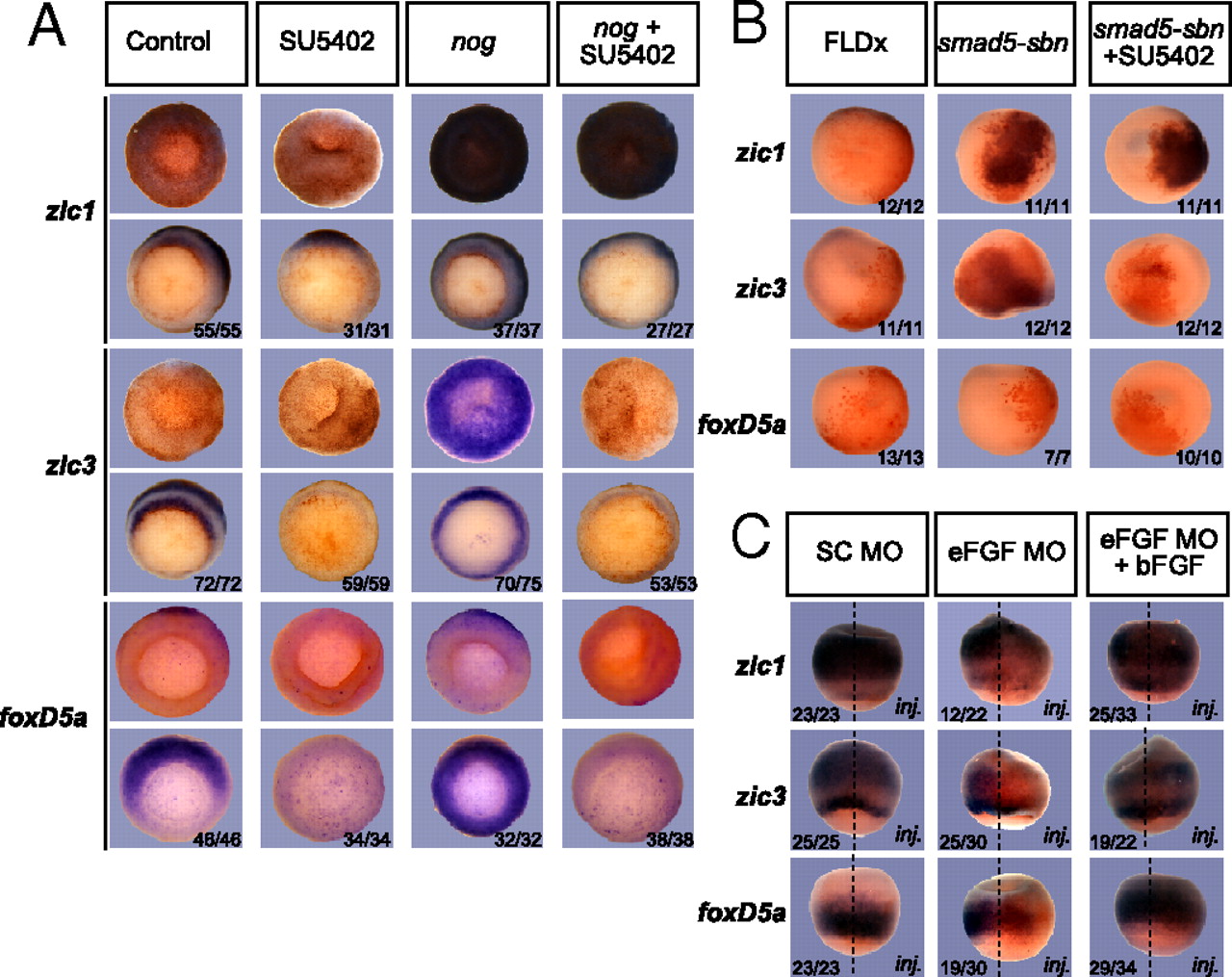 Fig. 2. zic1, zic3, and foxD5a show differential regulation by BMP and FGF signals. (A) SU5402 treatment (200 μM) was from 4-cell stage to stage 10.5, and noggin mRNA (1 ng/blastomere) was injected in all cells at 4-cell stage. zic3 and foxD5a, but not zic1, activation by Noggin depends on FGF activity. For each marker, animal (Top) and vegetal views (Bottom) are shown. (B) Ventral views of stage 13 embryos injected in one AB4 blastomere with 2.5 ng FLDx alone or with 3 ng smad5-sbn mRNA, or treated with 200 μM SU5402. (C) Dorsal views of stage 10.5 embryos injected marginally with 46 ng control MO or 46 ng FGF4 MO in one of the 2 dorsal cells at 4-cell stage. For the rescue assay, 350 pg of bFGF protein was injected in the blastocele at stage 8. Dotted line represents midline; inj, injected side.