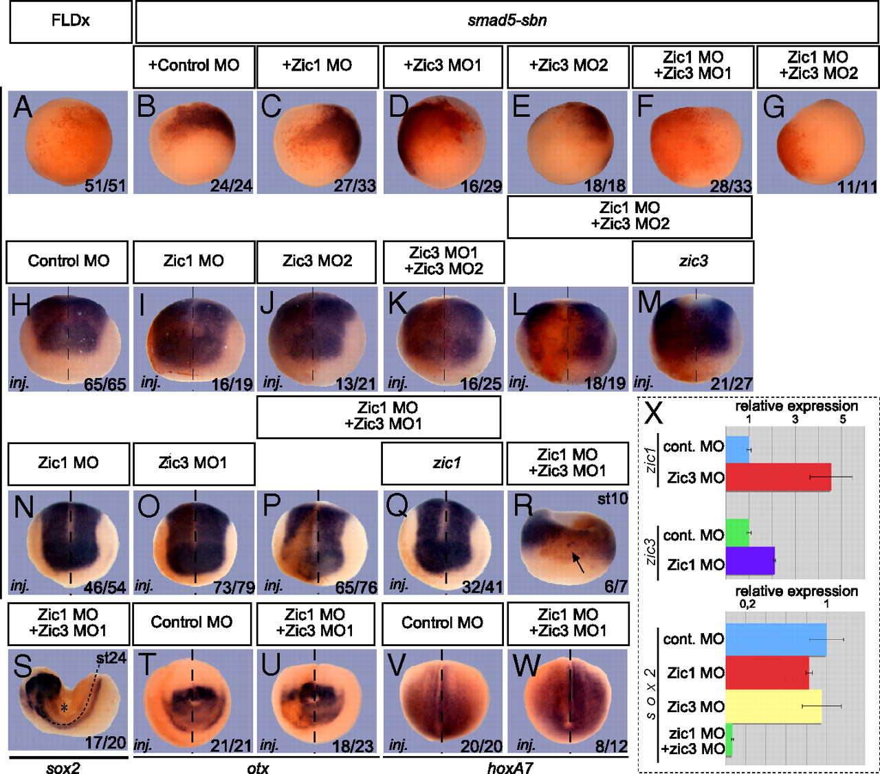 Fig. 4. Zic1 and Zic3 together are required for neural fate specification. (AâG) Ventral views of stage 13 embryos injected in one AB4 blastomere at 16-cell stage with 2.5 ng FLDx alone or with 3 ng smad5-sbn mRNA, and 23 ng control MO, 23 ng Zic1 MO, 23 ng Zic3 MO1, 23 ng Zic3 MO2, a mixture of 23 ng Zic1 MO and 23 ng Zic3 MO1, or a mixture of 23 ng Zic1 MO and 23 ng Zic3 MO2, as indicated. (HâW) Eight-cell embryos were injected in the 2 right animal blastomeres with 2.5 ng/blastomere FLDx and the indicated MOs (same amounts listed earlier). The combined knockdown of Zic1 and Zic3 leads to the suppression of sox2 expression at stage 10 (arrow in R), at stage 13 (L and P), and at stage 23 (S). Note the lack of sox2 staining in the posteriorbrain and spinal chord (asterisk in S). For rescue assays, 4-cell embryos were injected in the 2 right blastomeres with 500 pg zic3 (M) or zic1 (Q) mRNAs before MO injection. (HâQ) Dorso-anterior views at stage 13; (R and S) dorsal views; (T and U) anterior views at stage 15; and (V and W) posterior views at stage 15. (X) Four-cell embryos were injected with control or Zic MOs (same amounts as listed earlier in each of the 4 cells) and collected for quantitative RT-PCR analysis at stage 10.5.