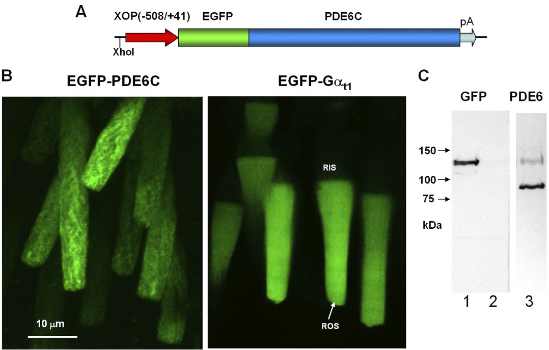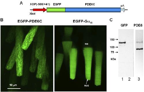 FIGURE 1. Expression of EGFP-PDE6C in transgenic rods. A, map of the transgene. The XhoI site was used to linearize the pXOP(508/ï°41)EGFP-PDE6C plasmid for production of transgenic X. laevis embryos. B, EGFP fluorescence in living photoreceptor cells expressing EGFP-PDE6C and EGFP-Gï°t. C, immuno- blotting of retinal extracts from transgenic (lanes 1 and 3) and non-transgenic retinas (lane 2) with anti-GFP B-2 monoclonal antibody (Santa Cruz Biotechnol- ogy, Inc., Santa Cruz, CA) (lanes 1 and 2) and anti-PDE6 MOE antibodies (CytoSignal) (lane 3). This research was originally published in The Journal of Biological Chemistry. Muradov et al âCharacterization of human cone phosphodiesterase-6 ectopically expressed in Xenopus laevis rods.â The Journal of Biological Chemistry, November 20, 2009; 284 (47): 32662-32669. © The American Society for Biochemistry and Molecular Biology. Reproduced with permission. |