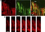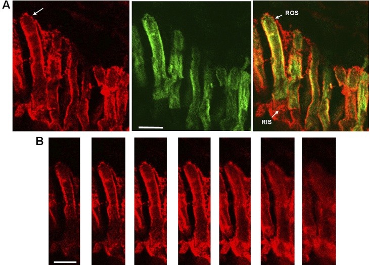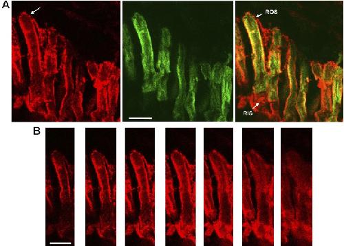 FIGURE 3. Co-localization of EGFP-PDE6C with endogenous PDE6 in transgenic rods. A, red, immunofluo- rescence of a retinal cryosection of a light-adapted transgenic tadpole stained with anti-PDE6 MOE antibody; green, EGFP fluorescence; overlay. Bar, 10 um. B, MOE antibody immunofluorescence. Z-Scans with an interval of 1 um through the retina cryosection in A showing the rod cell identified by the arrow. Bar, 10 um. This research was originally published in The Journal of Biological Chemistry. Muradov et al âCharacterization of human cone phosphodiesterase-6 ectopically expressed in Xenopus laevis rods.â The Journal of Biological Chemistry, November 20, 2009; 284 (47): 32662-32669. © The American Society for Biochemistry and Molecular Biology. Reproduced with permission. |