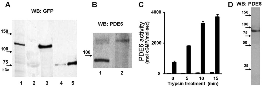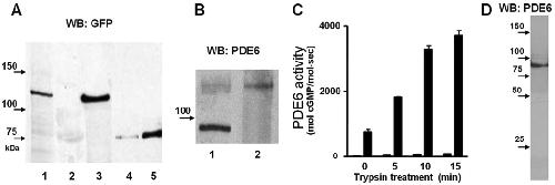 FIGURE 6. Immunoprecipitation and solubilization of PDE6C. A, immunoblotting (WB) with anti-GFP B-2 monoclonal antibody (Santa Cruz Biotechnology, Inc.). Lane 1, retinal extract (0.5 transgenic retina equivalent); lane 2, control immunoprecipitation with unrelated rabbit anti-GST antibody; lane 3, proteins immunoprecipitated from retinal extract (four transgenic retinas) with anti-GFP antibody (ab290, Abcam). Lanes 4 and 5, EGFP standards: 5 and 15 ng of purified E. coli expressed EGFP-PDE6C (446 819). B, immunoblot with anti-PDE6 MOE antibody. Lane 1, transgenic retina extract; lane 2, proteins immunoprecipitated from retinal extract with anti-GFP antibody. C, PDE6 activity of the immunoprecipitated proteins from non-transgenic (left bars) and transgenic (right bars) extracts prior to and following trypsin treatment was measured using 200 ï°M [3H]cGMP. D, after immunoprecipitation of EGFP-PDE6C with anti-GFP-antibody, the beads were treated with trypsin for 15 min. Proteins released into the soluble fraction were separated from the beads, reconstituted with soybean trypsin inhibitor, and analyzed by immunoblotting with anti-PDE6 MOE antibody. This research was originally published in The Journal of Biological Chemistry. Muradov et al âCharacterization of human cone phosphodiesterase-6 ectopically expressed in Xenopus laevis rods.â The Journal of Biological Chemistry, November 20, 2009; 284 (47): 32662-32669. © The American Society for Biochemistry and Molecular Biology. Reproduced with permission. |