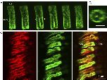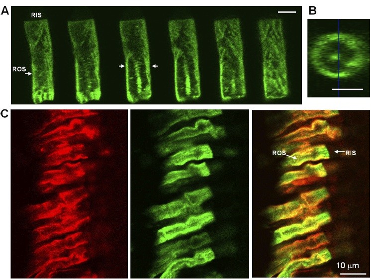 FIGURE 2. Localization of EGFP-PDE6C in transgenic rods. A and B, EGFP fluorescence in EGFP-PDE6C rod. A, Z-scans with an interval of 0.9 ï°m through ROS of a light-adapted transgenic tadpole. Bar, 5 ï°m. B, cross- section of the ROS in A corresponding to the position identified by arrows. Bar, 5 ï°m. C, co-localization of EGFP-PDE6C with peripherin-2 in transgenic rods. Red, immunofluorescence of a retinal cryosection of a light- adapted transgenic tadpole stained with monoclonal antibody Xper5A11 against anti-Xenopus peripherin-2; green, EGFP fluorescence; overlay. This research was originally published in The Journal of Biological Chemistry. Muradov et al âCharacterization of human cone phosphodiesterase-6 ectopically expressed in Xenopus laevis rods.â The Journal of Biological Chemistry, November 20, 2009; 284 (47): 32662-32669. © The American Society for Biochemistry and Molecular Biology. Reproduced with permission. |