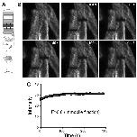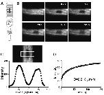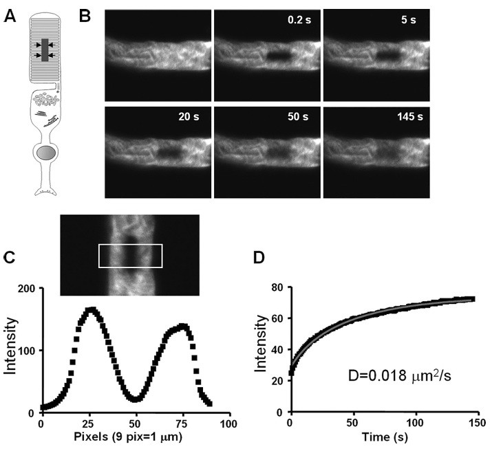 FIGURE 4. Analysis of lateral diffusion of EGFP-PDE6C by FRAP. A, photobleaching geometry to monitor lateral diffusion. The arrows indicate the direction of diffusion into the bleached stripe region. B, pre- and postbleach images of a transgenic ROS at different time points. The retina was incubated in Ringer buffer containing 6 mM 2-deoxyglucose and 10 mM NaN3. 150 images (256 ï° 256 pixels) were collected with a 1-s interval between the scans. C, intensity integrated along the y axis for each x axis pixel of the selected box region from the first postbleach image. The plot is used to determine the width of a bleach region with a Gaussian profile and the depth of bleach (21). D, intensities of the bleached region during the experimental time course corrected for background and fading and the fitting curve to a one-dimensional diffusion equation described previously (21). This research was originally published in The Journal of Biological Chemistry. Muradov et al âCharacterization of human cone phosphodiesterase-6 ectopically expressed in Xenopus laevis rods.â The Journal of Biological Chemistry, November 20, 2009; 284 (47): 32662-32669. © The American Society for Biochemistry and Molecular Biology. Reproduced with permission. |