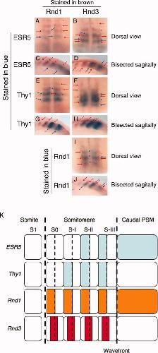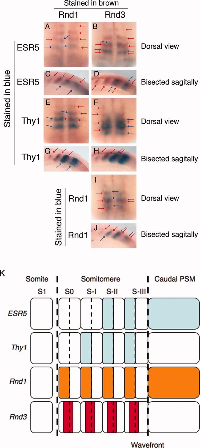 Figure 2. Comparison of expression domains between Rnd1/3 and Notch signal components at somitomeres. A-J: Embryos at neurula stage were double-stained in whole-mount with digoxigenin (DIG) -labeled probes of Rnd1 (A,C,E,G) or Rnd3 (B,D,F,H-J) and fluorescein-labeled probes of ESR5 (A-D), Thy1 (E-H), or Rnd1 (I,J). After staining, embryos were bisected sagittally (C,D,G,H,J). Red arrows show expression domains of DIG-labeled Rnd1 or Rnd3, and blue arrows show expression domains of fluorescein-labeled ESR5, Thy1, or Rnd1. Embryos are oriented with anterior to the top (A,B,E,F,I) or left (C,D,G,H,J). Dorsal views (A,B,E,F,I) and sectional lateral views (C,D,G,H,J) are shown. K: Schematic diagram shows expression domains of ESR5, Thy1 (both are stained in blue), Rnd1 (stained in orange), and Rnd3 (stained in red) at Xenopus neurula stage. S1, most posterior somite; S0-SIII, somitomeres from anterior to posterior. Each somitomeres are divided into anterior and posterior half by dot lines.